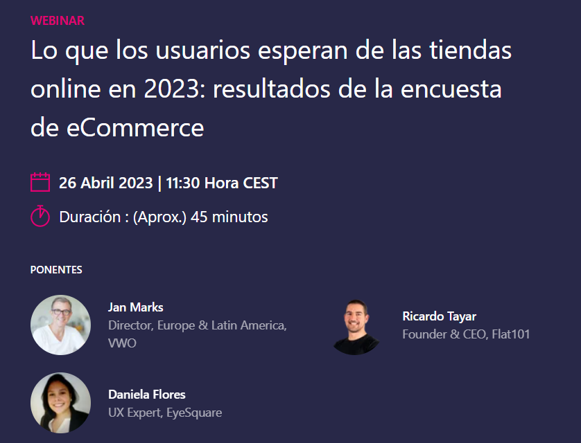 On April 26, 2023. 2023, you will have the opportunity to participate live in the webinar, this time hosted by VWO. Jan Marks (VWO), Ricardo Tayar (Founder & CEO, Flat 101), and Daniela Flores (eye square) will guide you through the Spanish-language webinar and give you in-depth insights into e-commerce and the motivations, pain points, and expectations of online shoppers.