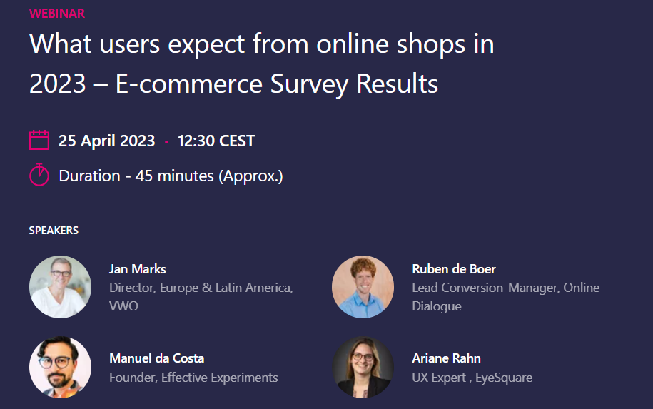 On April 25, 2023, you will once again have the opportunity to participate live in the webinar, this time conducted by VWO. Jan Marks (VWO), Ruben de Boer, (Lead Conversion Manager, Online Dialogue), Manuel de Costa (Founder, Effective Experiments) and Ariane Rahn (eye square) will guide you through the online seminar and give you profound insights into e-commerce and the motivations, pain points and expectations of online shoppers.