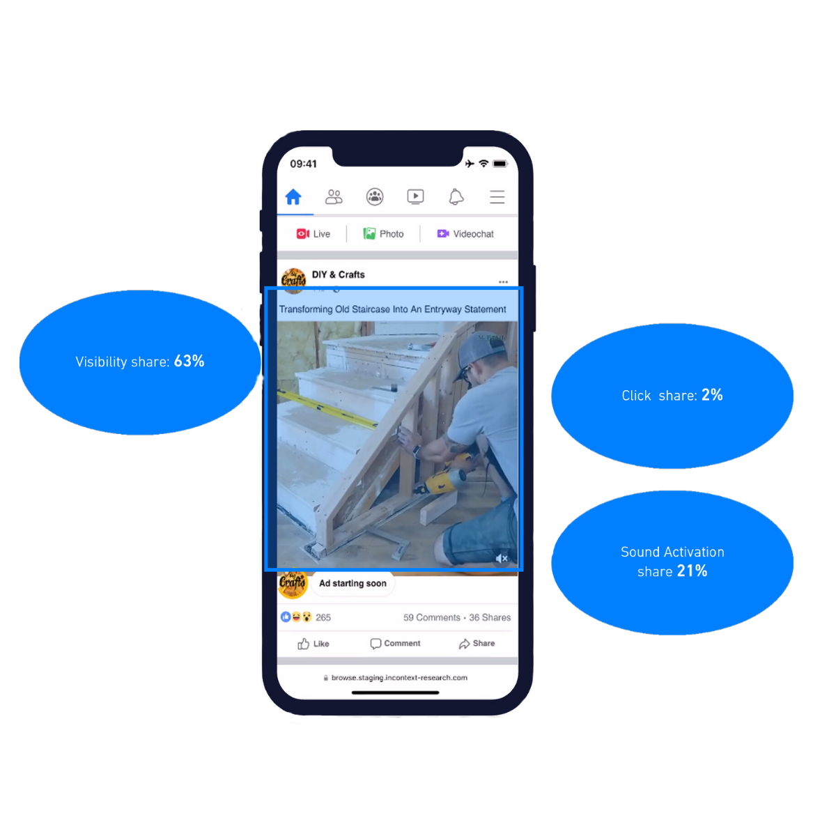 InContext Metrics (here visibility share, Click Share and Sound On Share) are automatically recorded, indicating how long an ad was visible on the screen , how many people clicked on it to interact with it and how many played the ad with audio on.
